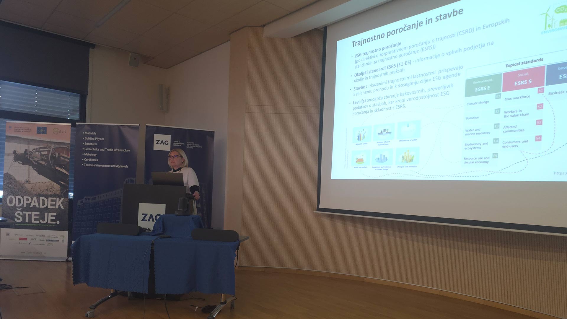 Predstavila je temo “Trajnostno poročanje in stavbe”, pri čemer je osvetlila vlogo ESG poročanja in nove evropske zakonodaje (CSRD in ESRS). Poudarila je, da stavbe z izkazanimi trajnostnimi lastnostmi pomembno prispevajo k zelenemu prehodu in izpolnjevanju ESG ciljev podjetij.