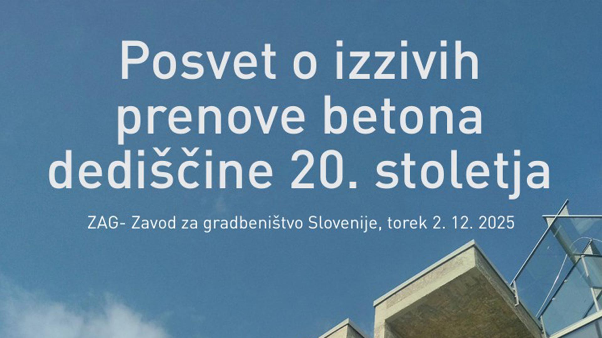 Zavod za gradbeništvo Slovenije v sodelovanju z Združenjem zgodovinskih mest Slovenije, E-RIHS.si in Zavodom za varstvo kulturne dediščine Slovenije organizira Posvet o izzivih prenove betona dediščine 20. stoletja, ki bo potekal v torek, 2. decembra 2025 (8.00–17.45), na Zavodu za gradbeništvo Slovenije v Ljubljani.